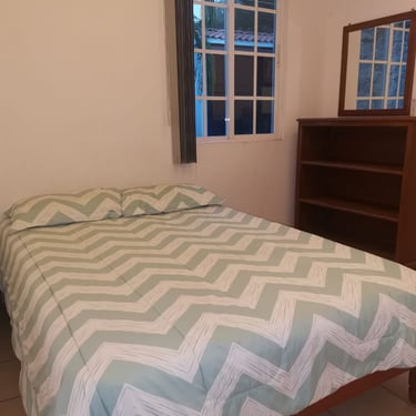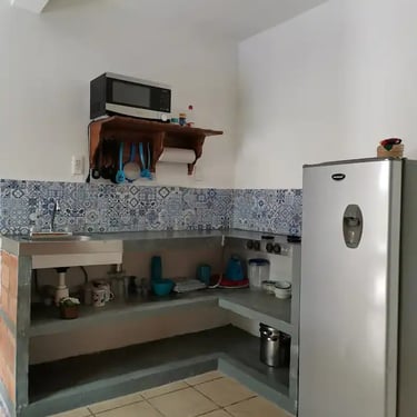 Cocina equipada (refrigerador, microondas, licuadora, utensilios)
